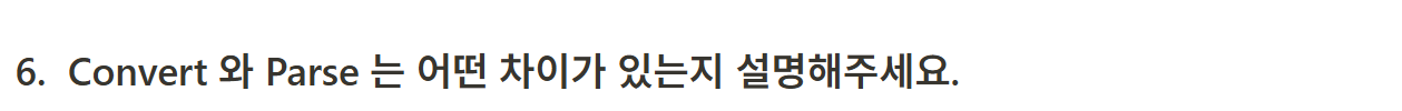 Lv1. 데이터와 연산자 - 1. 데이터 다루기 중 6번 문제▶ Convert 와 Parse의 차이 (+TryParse)1. Convert는 기본 데이터 형식을 다른 기본 데이터 형식으로 변환한다. 형변환 실패시 오류가 뜬다.// Convert ==