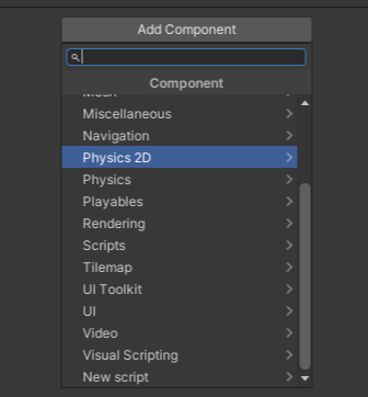 - Physics2D에는 충돌 관련 컴포넌트와 물리적인 움직임(중력, 마찰력 등)을 적용하는 컴포넌트가 있다.