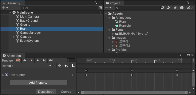 - 생성한 애니메이션 파일 차일 열고, 애니메이션을 적용할 캐릭터를 선택(Rtan)