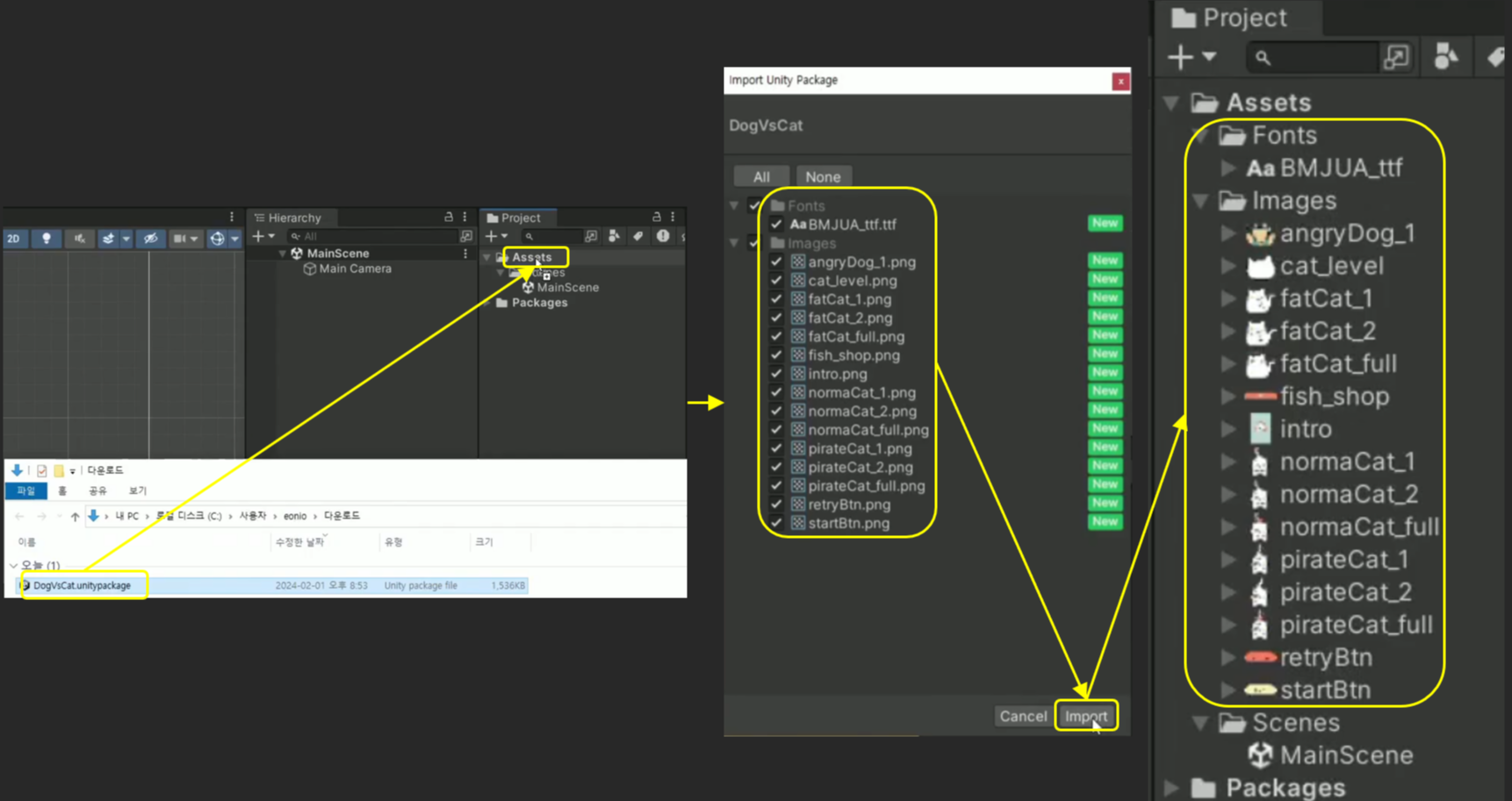 - .unitypackage 파일은 다른 프로젝트에서 만든 에셋, 스크립트, 폰트 등을 손쉽게 재사용할 수 있는 포맷이다.
