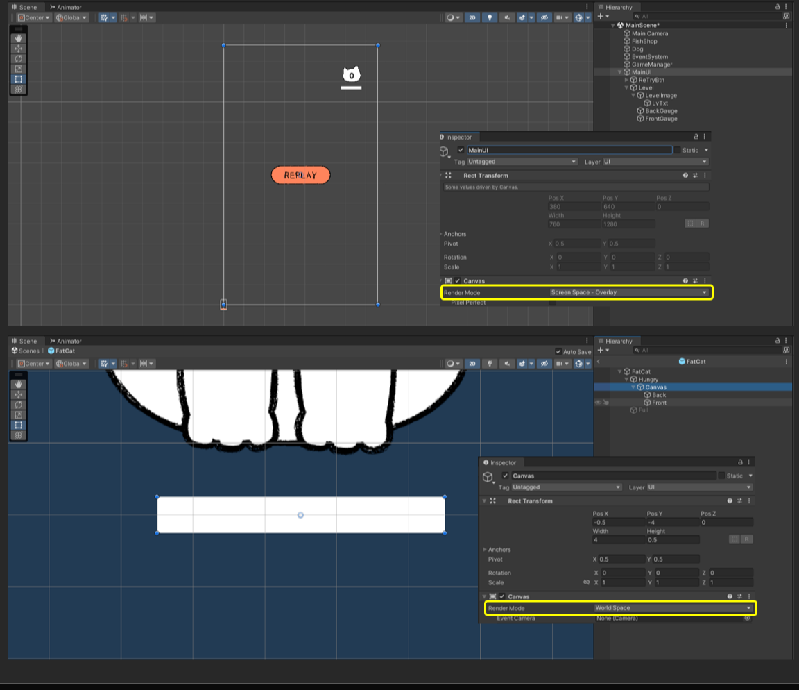 - 예시: 이번 프로젝트 중 고양이의 배고픔 게이지는 World Space, 메인UI는 Screen Space - Overlay로 설정