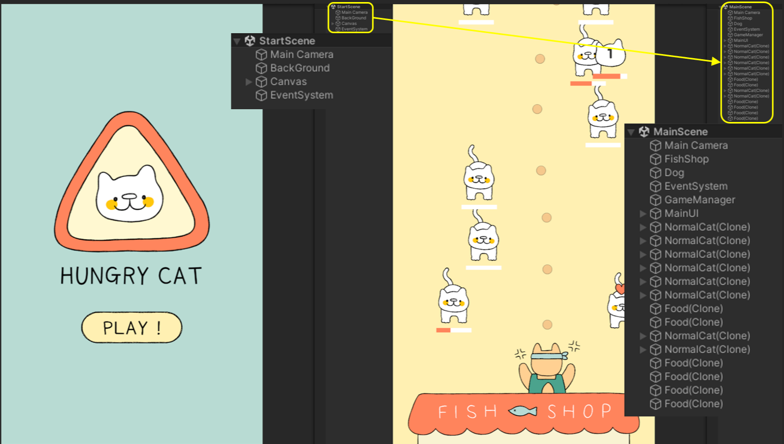 - 예시 2: Start버튼을 누르면 StartScene에서 MainScene으로 전환된다.