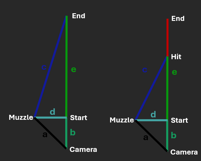 - 총알이 카메라와 총구 사이로 발사 되지 않도록, 카메라와 총구까지의 깊이(b)를 계산하고, 카메라 조준점 방향으로 그만 큼 보정 거리를 더한 후, 그 위치를 라인 트레이스 시작 위치로 설정하였다.