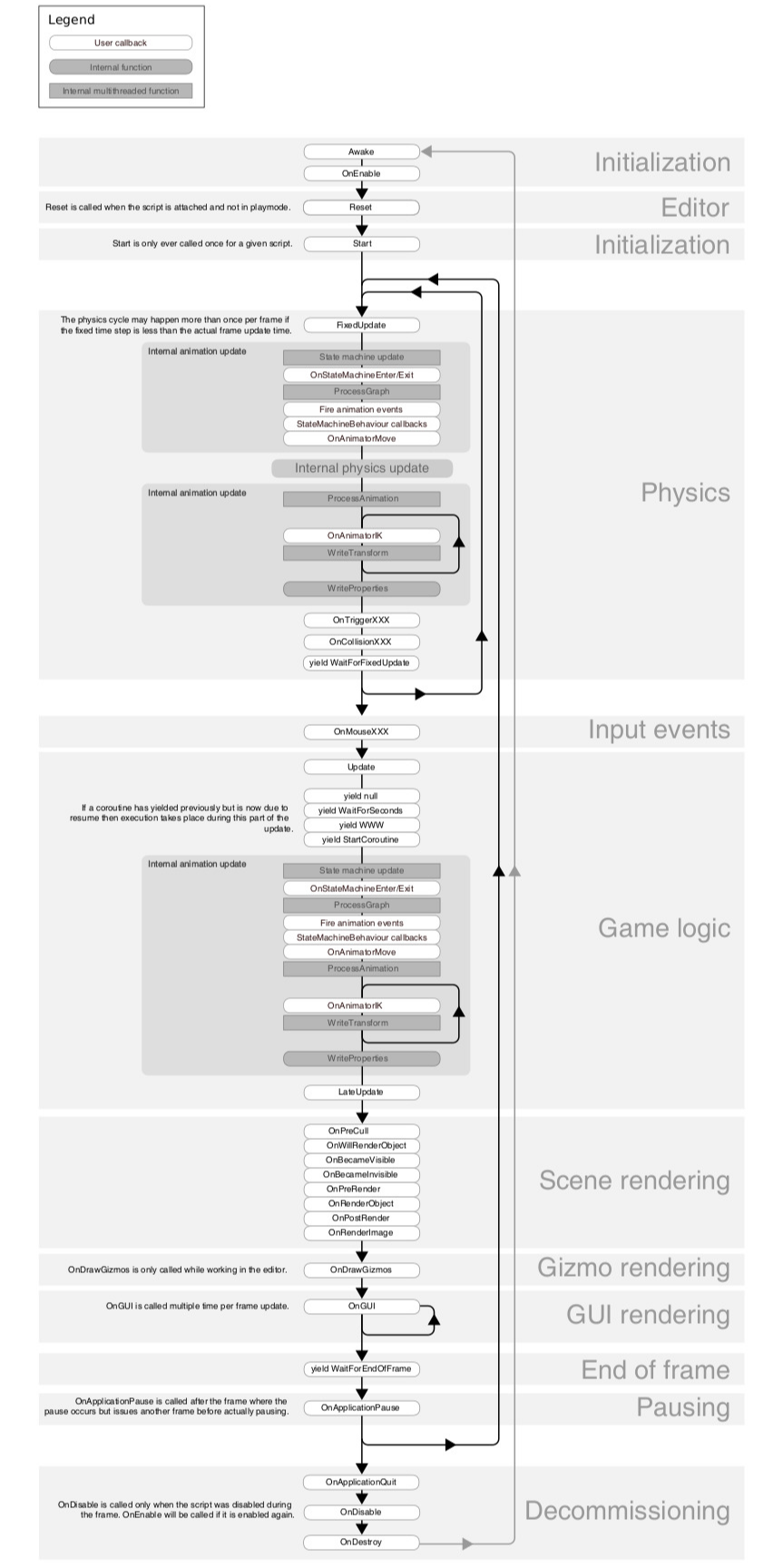 - 우선 Unity에서는 오브젝트가 생성될 때 다음과 같은 순서로 주요 생명 주기 함수가 호출된다.
